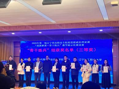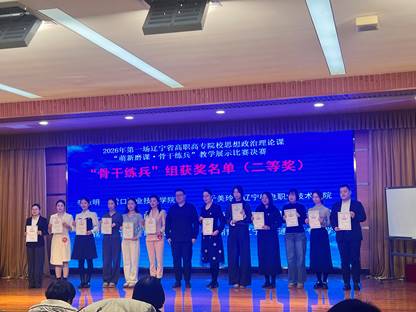 1月13日至14日,2026年辽宁省高职高专院校思想政治理论课首场“萌新磨课,骨干练兵”教学展示活动在辽宁轻工职业学院举行。本次活动在辽宁省教育厅指导下,由辽宁省高职高专院校思想政治理论课建设联盟、辽宁省“高职高专思想政治理论课”分教学指导委员会主办。我校马克思主义学院选派两位教师参赛并喜获佳绩:郭聃雪老师荣获“萌新磨课”组二等奖;孔晓健老师荣获“骨干练兵”组三等奖。